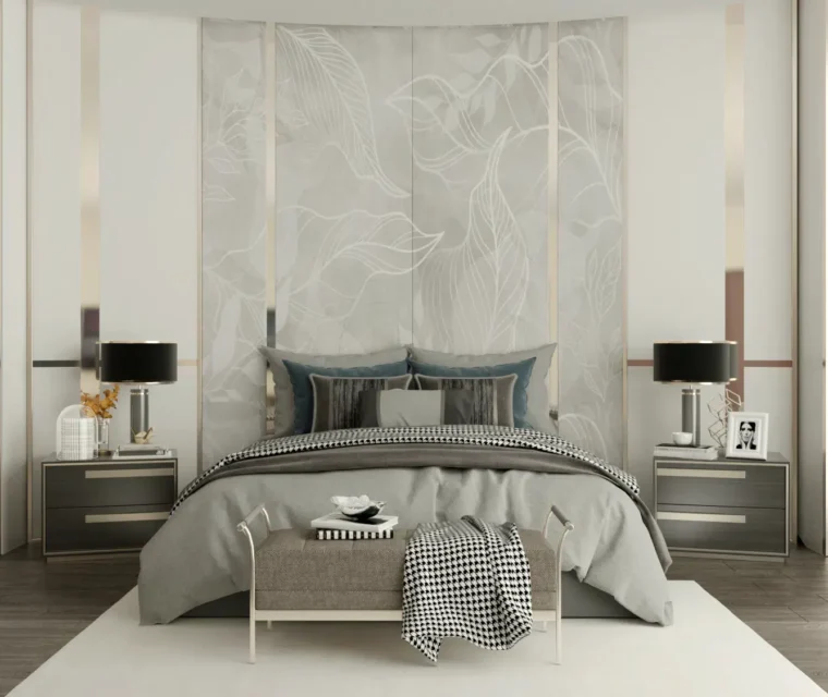 يُشعّ تصميم غرفة النوم ثلاثية الأبعاد هذا بالهدوء من خلال نهج بسيط، بخطوطه الأنيقة وألوانه المتناغمة. السرير المركزي، المُحاط بمصابيح مُعلقة ومُثبت على ألواح خشبية عمودية، يُضفي على المكان أناقةً هادئة. يُعزز هذا الهدوء أجواءً هادئةً مثاليةً للراحة والتأمل.