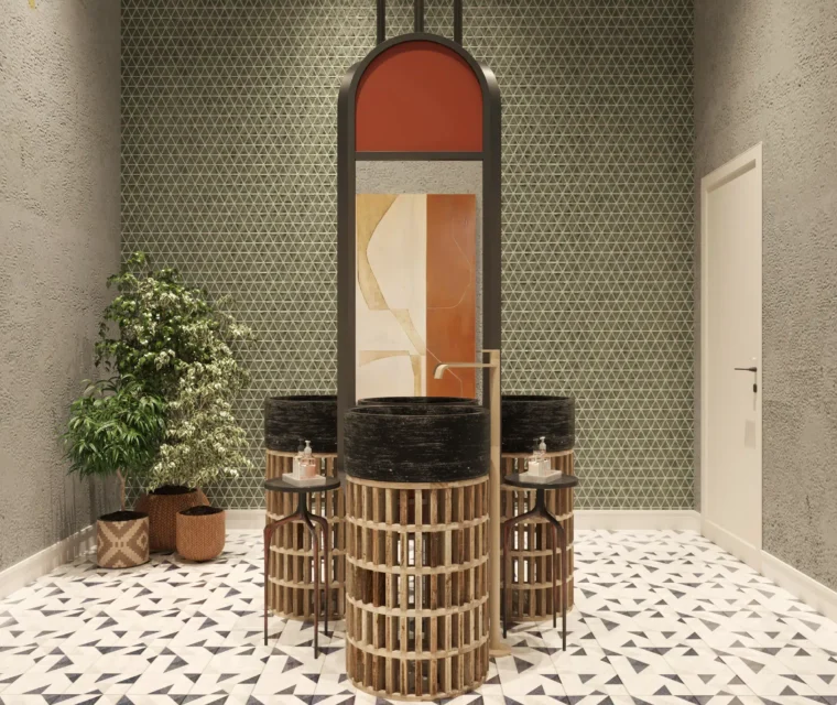 الميزة الأبرز هي التركيبة الجدارية الآسرة ذات النمط الموجي، والتي تُضفي عمقًا وحركةً وروحًا فنيةً على المكان. تُحاكي خطوطها الترابية المتدفقة برقةٍ أجواءَ حفل الزفاف الاحتفالي، مُضيفةً لمسةً بصريةً مميزةً للغرفة بأكملها. تنتقل الألوان بسلاسة، مُعززةً تناغم التصميم العام.
